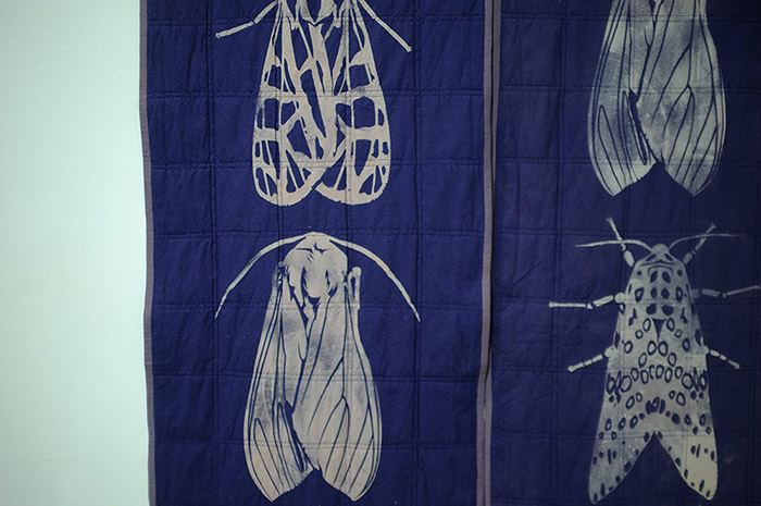 I’m pleased to debut as an artist with my self-developed stencil hand-bleaching technique which is, I believe, the most suitable for what and how I want to express myself. Therefore It is a good combination of my initial graphics and resulting artworks. The hand-bleached stencil technique meaningfully emphasizes graphics in prints, at the same time textile is the most beneficial material to represent the graphics as it adds depth and elegance to the final result.