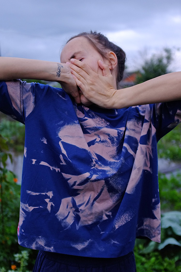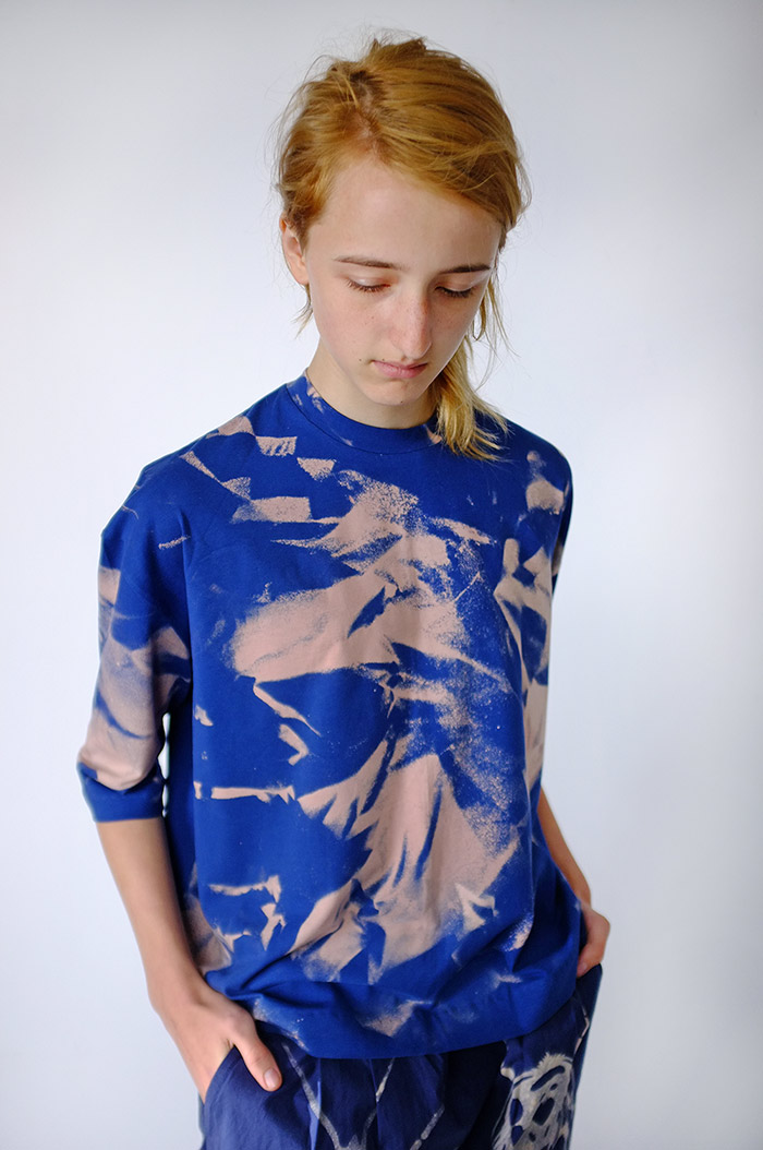 In spite of the fact that I can make really elaborate detailed printswith my hand-bleaching technique, really simple and primitive chloride stains and spreads are what I like the most. That’s why I was so inspired to create this T-shirt for my SS15 collection. I wanted to have a bright spot of expression and indeterminism, the things I adore so much in the chloride bleached prints.